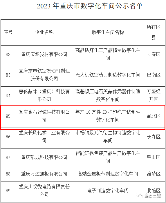 近日,重庆市经济和信息化委员会发布《2023年重庆市数字化车间和智能工厂拟认定结果公示》。重庆金石智诚科技有限公司作为3D打印行业相关领域唯一入选企业,成功通过2023年重庆市数字化车间认定,认定项目名为“年产10万件3D打印汽车试制件数字化车间”。